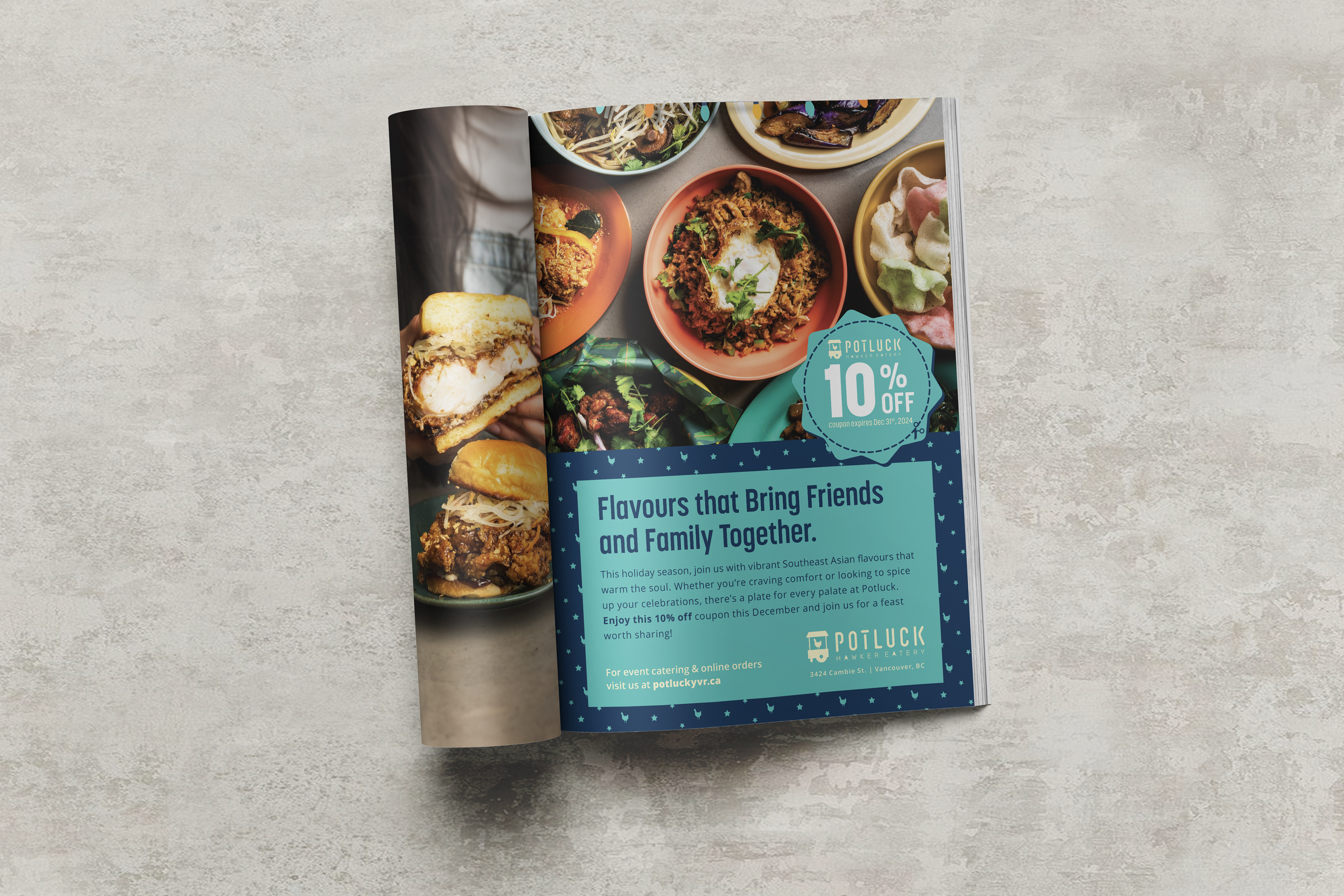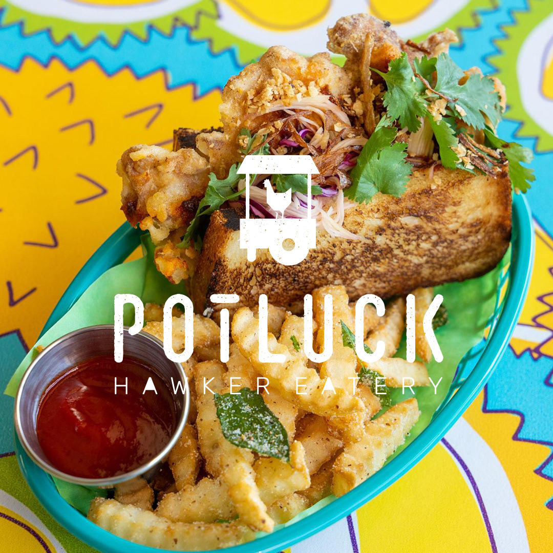 Potluck Hawker Eatery was a beloved Southeast Asian street-food destination in Vancouver’s Cambie Village, celebrated for bold flavours, vibrant ambience, and a loyal following during its five-year run. As the brand’s designer, I developed the logo and visual system and extended it into every touchpoint — interior graphics, food wraps, menu boards, exterior signage, sandwich boards, and ad materials.