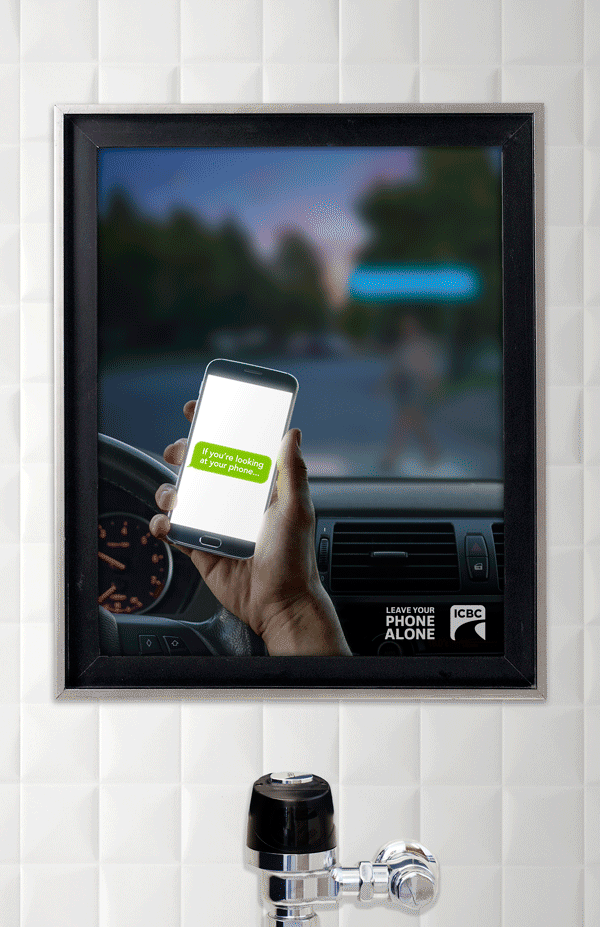 An innovative lenticular print execution showing that drivers can focus on either their phone or the road — but never both — visually demonstrating the danger of distracted driving.